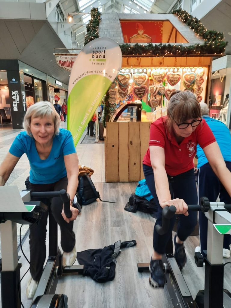 Wir hatten ursprünglich 3 Fahrräder und 2 Handergometer gebucht. Da vormittags weniger los war, konnten unsere Damen sogar zusätzliche Räder nutzen. Fast hätten wir am Abend noch ein weiteres Rad ergattert – leider ging die Verlosung unter vier Vereinen nicht zu unseren Gunsten aus.